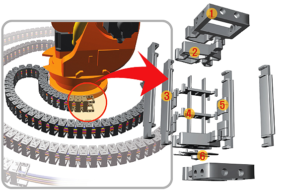 | 固定座 固定旋轉式電纜兩端部分 提高順暢的牽引和移動效率,可三方向的固定電纜拖鏈。 側邊本體 特殊的技術開發,這種側邊本體可以連接任何你想要的彎曲和連接方法 。 橫桿 連接橫桿與側邊本體結合,由框架內的平滑防止電纜摩擦。 分隔片 可以分開內部電纜和更有效地利用電纜拖鏈的內部空間,並防止電纜表面的損傷和電纜之間的摩擦破壞。 固定板 此產品控制分隔片和固定位置的位置,它可以不同的寬度施加壓安裝到拖鏈內。 |